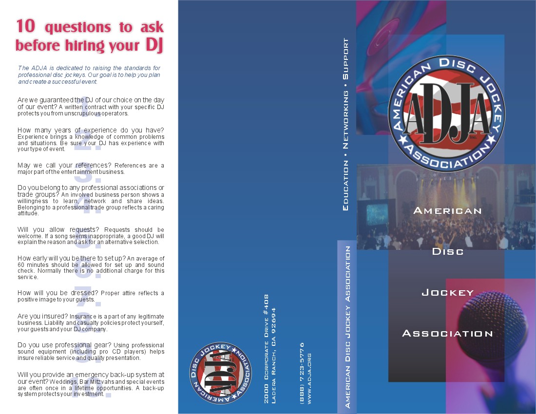 • Color Brochures4-color brochures – ( Side one sample ) ( Side Two Sample )These brochures are great for prospective clients and related-vendors. The brochure features the “10 questions to ask a DJ” and explains the role of the ADJA and why someone should choose an ADJA member. It features our LOGO and has two “die cuts” so you can slip your business card in the brochure.